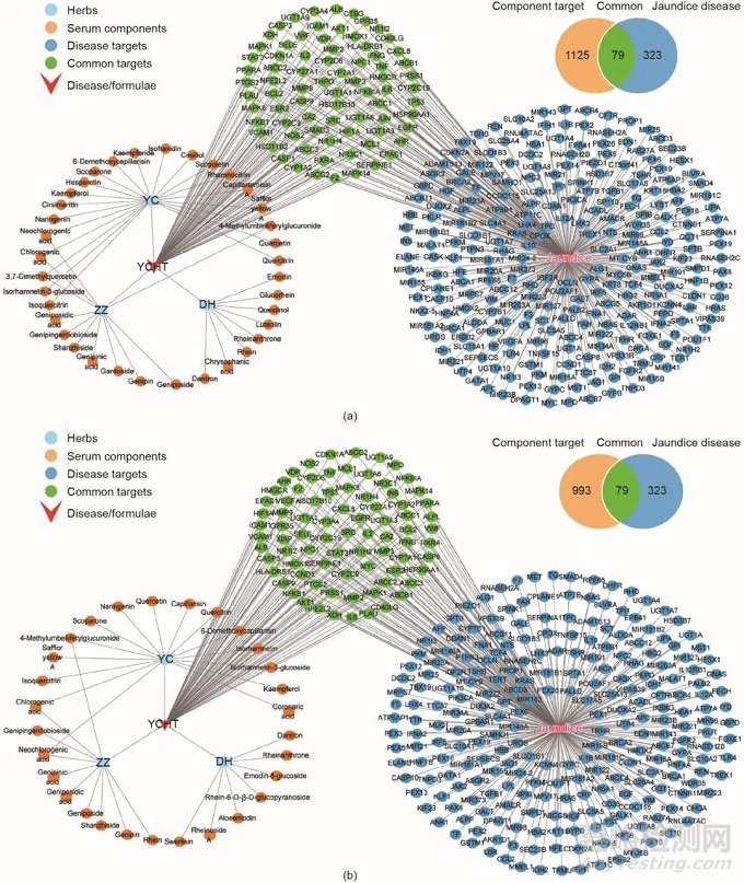 圖7. 茵陳蒿湯入血成分和黃疸病共同作用靶標(biāo)網(wǎng)絡(luò)圖。(a)小鼠黃疸病和入血成分的特有和共同靶標(biāo)。網(wǎng)絡(luò)圖呈現(xiàn)36個(gè)茵陳蒿湯入血成分(橘色),以及與茵陳蒿湯(紅色)關(guān)聯(lián)的三種單味藥(淺藍(lán)色)和與膽汁淤積性黃疸(紅色)相關(guān)的323個(gè)特有靶標(biāo)(藍(lán)色),兩者有79個(gè)共同靶標(biāo)(綠色)。(b)臨床黃疸病和入血成分的特有和共同靶標(biāo)。網(wǎng)絡(luò)圖呈現(xiàn)29個(gè)茵陳蒿湯入血成分(橘色),以及與茵陳蒿湯(紅色)關(guān)聯(lián)的三種單味藥(淺藍(lán)色)和與膽汁淤積性黃疸(紅色)相關(guān)的323個(gè)特有靶標(biāo)(藍(lán)色),兩者有79個(gè)共同靶標(biāo)(綠色)。