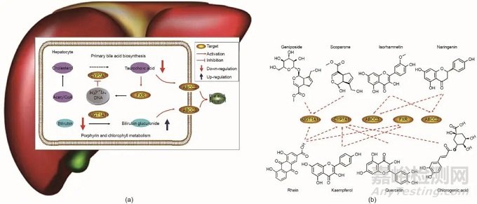 圖8. 整合代謝組學(xué)、血清藥物化學(xué)和網(wǎng)絡(luò)藥理學(xué)的研究策略,發(fā)現(xiàn)茵陳蒿湯潛在靶標(biāo)和活性化合物。(a)茵陳蒿湯治療黃疸病的功能機(jī)制圖;(b)新穎的靶標(biāo)和潛在活性化合物之間的靶向關(guān)系。