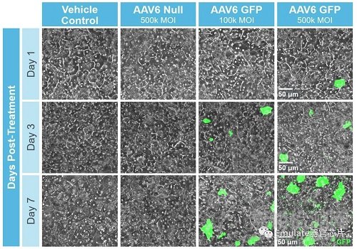 圖注:在血友病研究中,AAV6是治療性研究的主要載體之一。為了評估Emulate肝臟芯片在預(yù)測AAV轉(zhuǎn)導(dǎo)和肝臟毒性風(fēng)險方面的作用,用編碼綠色熒光蛋白(GFP)的AAV6載體處理肝臟芯片。AAV6表現(xiàn)出時間和濃度依賴性的轉(zhuǎn)導(dǎo)表型,而肝實質(zhì)細胞和肝竇內(nèi)皮細胞保持健康的形態(tài),沒有毒性信號存在。