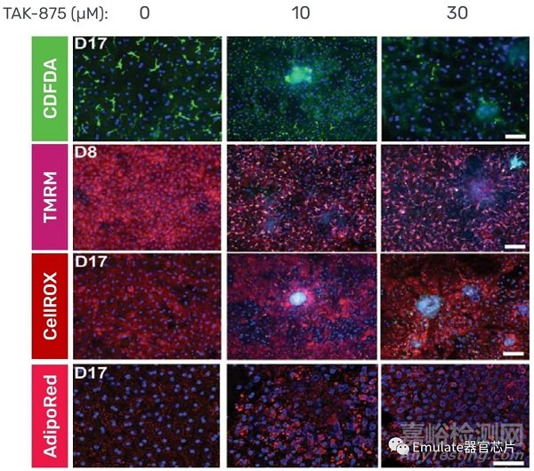 圖注:識別特異性DILI的風(fēng)險。每天用TAK-875處理人類肝臟芯片,劑量相當于人類的Cmax(10μM),以確定它們是否能檢測DILI。對 MRP2底物CDFDA(綠色)的膽汁外流進行共聚焦顯微鏡分析顯示,TAK-875導(dǎo)致MRP2活性的劑量依賴性下降。同時,通過測量TMRM的劑量相關(guān)和時間依賴的重新分布、脂滴積累和活性氧(ROS)的形成,證實TAK-875的治療對線粒體膜電位有影響。這些結(jié)果與TAK-875治療的臨床結(jié)果一致,表明肝臟器官芯片可用于評估特異性DILI。