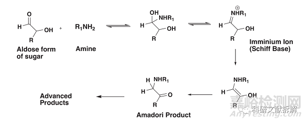 小分子藥物與還原糖的反應(yīng)通過形成亞胺離子和席夫堿(美拉德反應(yīng)),并通過連續(xù)的復雜共軛反應(yīng)進一步生成Amadori產(chǎn)物和高級降解產(chǎn)物。