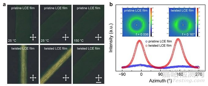 經(jīng)過加捻的復(fù)合纖維表面的LCE從無序變?yōu)橛行?,偏光顯微鏡和WAXS的結(jié)果都證明了這一點(diǎn),加捻后LCE的取向變好,取向因子增加,表明螺旋應(yīng)力有效誘導(dǎo)了液晶分子的排列(圖2)。