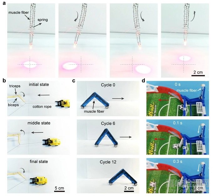 基于LCE/CNT螺旋纖維優(yōu)異的驅(qū)動(dòng)性能及自恢復(fù)特性。研究團(tuán)隊(duì)將這種高性能的仿生肌肉纖維作為驅(qū)動(dòng)單元與機(jī)械結(jié)構(gòu)結(jié)合起來,演示了其在類內(nèi)窺鏡上的作用,可以實(shí)現(xiàn)內(nèi)窺鏡鏡頭的三向彎曲。進(jìn)一步將纖維集束與仿生手臂結(jié)合,模仿人的手臂實(shí)現(xiàn)了拉車的動(dòng)作。此外,基于纖維的快速響應(yīng)特性,利用其瞬間的爆發(fā)力,纖維在機(jī)械爬蟲及踢足球場(chǎng)景下都具有一定的應(yīng)用潛力。(圖4)
