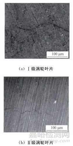 對(duì)垂直小裂紋磨制金相并進(jìn)行顯微觀察,裂紋細(xì)小末端尖銳,沿晶擴(kuò)展,Ⅰ級(jí)和Ⅱ級(jí)渦輪葉片裂紋深度均約為0.1mm。