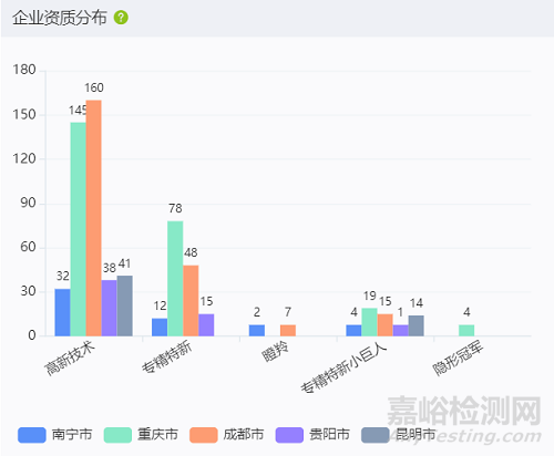 從企業(yè)資質(zhì)分布看,截止2023年5月底,生物醫(yī)藥產(chǎn)業(yè)領(lǐng)域相關(guān)的高新技術(shù)企業(yè),南寧32家、重慶145家、成都160家、貴陽38家、昆明41家;專精特新企業(yè),南寧12家、重慶78家、成都48家、貴陽15家、昆明0家;專精特新小巨人企業(yè),南寧4家、重慶19家、成都15家、貴陽1家、昆明14家。