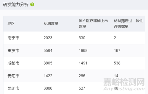 從研發(fā)能力看,截止2023年5月底,專利數(shù)量方面,南寧有2023個(gè)、重慶有5564個(gè)、成都有8805個(gè)、貴陽有1422個(gè)、昆明有3006個(gè);國產(chǎn)醫(yī)療器械上市數(shù)量方面,南寧有630個(gè)、重慶有1998個(gè)、成都有1491個(gè)、貴陽有266個(gè)、昆明有527個(gè);仿制藥通過一致性評價(jià)數(shù)量方面,南寧有2個(gè)、重慶有197個(gè)、成都有538個(gè)、貴陽有14個(gè)、昆明有40個(gè)。