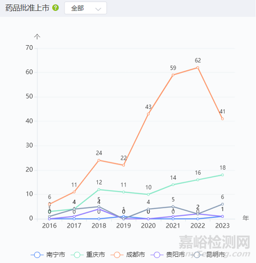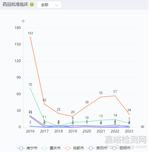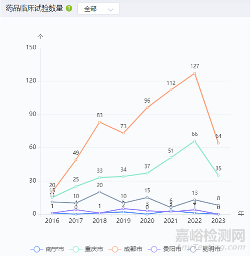 從藥品臨床試驗(yàn)數(shù)量看,從2016年至2023年,南寧市、重慶市、成都市、貴陽市、昆明市的藥品批準(zhǔn)上市總數(shù)分別為2個(gè)、88個(gè)、268個(gè)、9個(gè)、27個(gè)。對2016年-2023年數(shù)據(jù)求和,在全國所有城市中,南寧市排 166 名,重慶市排 14 名,成都市排 2 名,貴陽市排 81 名,昆明市排 40 名。。