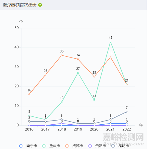 圖:西南地區(qū)主要城市醫(yī)療器械首次注冊數(shù)量情況