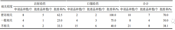本文對 39 個 IND 的 NCHAIDs 功能主治與所用藥材(以提取物為原料的,按制備提取物所用藥材計)的功能主治進(jìn)行比較,按照二者的相關(guān)程度分為密切相關(guān)、一般相關(guān)、不相關(guān) 3 類。密切相關(guān):新藥制劑的功能主治與藥材功能主治存在相同表述;一般相關(guān):制劑功能主治與藥材功能主治表述相似,根據(jù)中醫(yī)藥理論推測有相關(guān)性;不相關(guān):制劑功能主治與藥材功能主治無相似表述,二者無相關(guān)性。從表 1 可知,IND 的 NCHAIDs 中,功能主治與藥材的相關(guān)性越高,其批準(zhǔn)率越高。