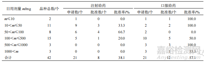 44 個 NCHAIDs 中,有 42 個根據(jù)前期研究初步提出了臨床擬用劑量,見表 4。從有效成分的日用劑量與給藥途徑的關(guān)聯(lián)看,有效成分口服給藥的日用劑量較大,注射給藥的日用劑量相對較低。日用劑量超過 500 mg 的品種均為口服制劑。