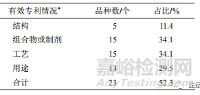 從中藥 NCHAIDs 擁有的有效專利數(shù)量來看,44 個 NCHAIDs 中,僅 23 個新藥品種擁有有效專利,占比約 52.3%(其中以個人作為申請人的藥品專利不在統(tǒng)計范圍)。其中結(jié)構(gòu)專利占比最低,僅11.4%。用途專利占 29.5%。主要原因是大部分中藥有效成分為已知成分且用途也被公眾所熟悉,無法滿足現(xiàn)有專利法關(guān)于新穎性和創(chuàng)造性的要求,因此難以獲得專利保護(hù)。其中也有專利工作較好,如某新藥,有效專利總數(shù) 16 個,其中,結(jié)構(gòu)專利 3 個,用途專利 7 個,工藝、組合物或制劑專利各 3 個。