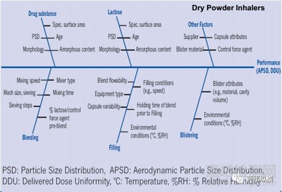 基于對上述體內(nèi)吸入過程的理解,吸入制劑的開發(fā)的重中之重則為如何實現(xiàn)適量藥物在肺內(nèi)的沉積進(jìn)而實現(xiàn)治療作用,而對于吸入仿制制劑的開發(fā)而言實現(xiàn)藥物在呼吸系統(tǒng)各部位的等量沉積是保證治療等效的重要基礎(chǔ)。顯然,吸入制劑的關(guān)鍵質(zhì)量屬性除了常規(guī)制劑含量、有關(guān)物質(zhì)等之外還包括APSD(AerodynamicParticle size Distribution)以及DDU(Delivered DoseUniformity)等其特有的質(zhì)量屬性。吸入制劑終產(chǎn)品的獲得是一系列開發(fā)項目綜合作用的結(jié)果。主要影響因素包括配方、生產(chǎn)工藝、吸入裝置以及包裝密封系統(tǒng),具體研究細(xì)節(jié)方面問題希望同行多多交流。