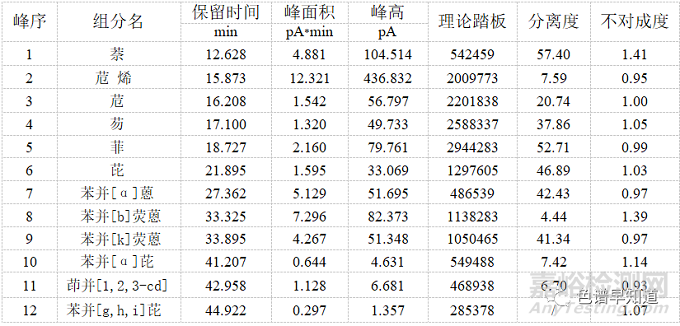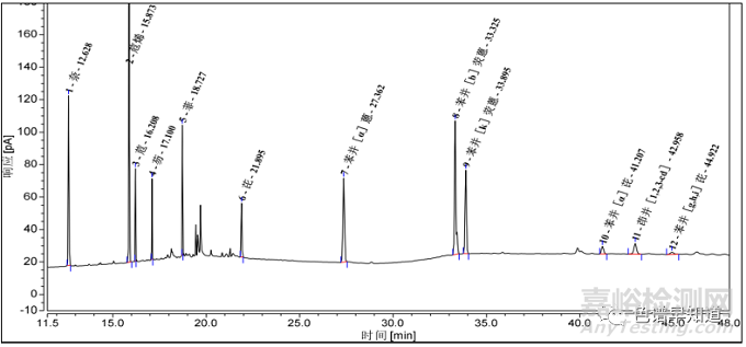 蘭州中科安泰分析科技有限責(zé)任公司利用生產(chǎn)的氣相毛細(xì)管色譜柱,結(jié)合多環(huán)芳烴測(cè)定的相關(guān)標(biāo)準(zhǔn),對(duì)12種多環(huán)芳烴進(jìn)行色譜條件測(cè)試和優(yōu)化,測(cè)試結(jié)果色譜圖中該類(lèi)化合物均表現(xiàn)出峰形好、響應(yīng)高、分離度好等效果。因此,使用中科安泰該款色譜柱AE.SE-54(30m*0.32mm*0.25um) 能夠?qū)υ摶衔镞_(dá)到較好的分離效果,從而能夠準(zhǔn)確的進(jìn)行定性和定量分析。
