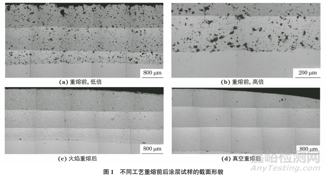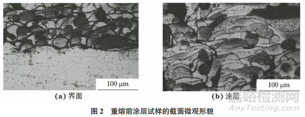 采用電火花切割機(jī)在重熔前后的涂層試樣上截取金相試樣,經(jīng)砂紙打磨、機(jī)械拋光,采用光學(xué)顯微鏡(OM)對(duì)涂層截面形貌進(jìn)行觀察,通過ImageProPlus軟件在相同倍數(shù)的金相照片中對(duì)涂層的孔隙率進(jìn)行統(tǒng)計(jì)。將金相試樣用飽和草酸溶液電解腐蝕3s后,用OM觀察涂層的顯微組織。采用場(chǎng)發(fā)射掃描電鏡(SEM)對(duì)重熔前后涂層的微觀形貌進(jìn)行觀察,并用SEM配備的能譜儀(EDS)對(duì)孔隙附近的微區(qū)成分進(jìn)行分析。采用維氏硬度計(jì)測(cè)試涂層試樣截面硬度,載荷為2.94N,保載時(shí)間為15s,測(cè)點(diǎn)間距為1mm。
