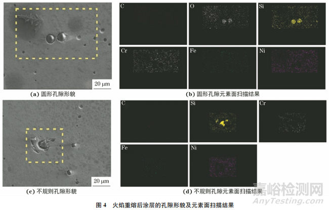 高重熔溫度和延長(zhǎng)保溫時(shí)間進(jìn)行改善。不規(guī)則孔隙內(nèi)存在形狀不規(guī)則的夾雜物,經(jīng)EDS分析確定夾雜物富含硅元素,說明火焰重熔后涂層的不規(guī)則孔隙中析出了SiO2顆粒。SiO2顆粒會(huì)阻礙液態(tài)金屬對(duì)孔隙的填充,從而形成不規(guī)則孔隙。