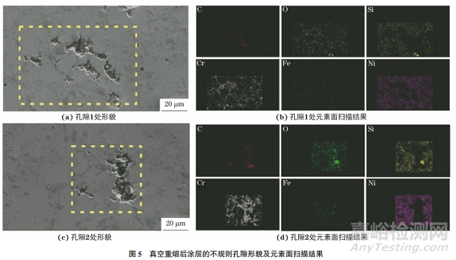 由圖5可以看出:真空重熔涂層中有些不規(guī)則孔隙內(nèi)富含碳、氧、鉻元素,不存在鎳、鐵元素,因此推斷孔隙中存在鉻的碳化物和氧化物。這些化合物的熔點(diǎn)較高,在重熔過程中未熔化導(dǎo)致不規(guī)則孔隙的形成。還有些不規(guī)則孔隙內(nèi)存在顆粒狀?yuàn)A雜物,主要構(gòu)成元素為硅和氧,判斷應(yīng)為SiO2,同時(shí)孔隙中局部位置的鉻和碳含量較高,推斷應(yīng)存在鉻的碳化物。SiO2和鉻的碳化物熔點(diǎn)均較高,聚集在一起會(huì)阻礙涂層材料重熔后對(duì)孔隙的充分填充,導(dǎo)致不規(guī)則孔隙的形成。火焰重熔后涂層孔隙中存在SiO2夾雜物顆粒,孔隙形狀小且規(guī)則;真空重熔后涂層中除了存在SiO2 還存在鉻的碳化物,孔隙形狀大且不規(guī)則。