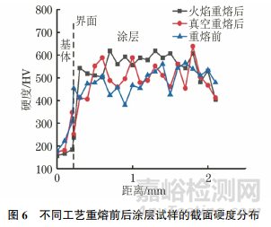 由圖6可以看出,不同工藝重熔前后涂層的硬度均高于基體的硬度。火焰噴涂制備涂層的平均硬度為485HV,經(jīng)火焰重熔和真空重熔處理后,涂層的平均硬度分別提高至545,500HV;2種重熔工藝均可提升涂層的硬度?;鹧嬷厝弁繉拥挠捕茸罡咔矣捕炔▌?dòng)較小,真空重熔涂層的硬度略高于未重熔涂層,但硬度波動(dòng)較大,這是由于火焰重熔后涂層的組織比真空重熔涂層更細(xì)小均勻所致。