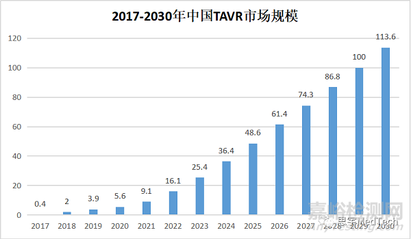 根據(jù)Frost&Sullivan數(shù)據(jù),中國經(jīng)導(dǎo)管主動脈瓣置換術(shù)(TAVR)市場規(guī)模由2017年的4000萬元增長至2021年的9.1億元,預(yù)計到2030年中國TAVR市場規(guī)模將達(dá)到113.6億元,2021至2030年的復(fù)合增長率為32.4%。