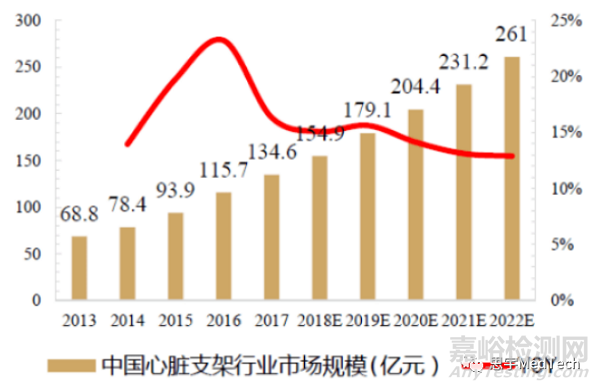 據(jù)沙利文數(shù)據(jù),2013-2017年,中國心臟支架行業(yè)市場規(guī)模從68.8億元增長到134.6億元,年復(fù)合增長率到18.3%。預(yù)計未來5年中國心臟支架行業(yè)市場規(guī)模仍將保持13.9%的年復(fù)合增長率持續(xù)增長,2022年達(dá)到261億元。
