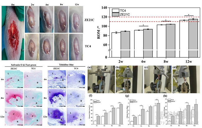 本研究又從影像學(xué)、膝關(guān)節(jié)功能恢復(fù)、組織學(xué)以及生物力學(xué)等角度分析了ZE21C縫合錨釘對(duì)韌帶-骨的組織修復(fù)效應(yīng)(圖3)。從大體觀察可以看出,隨著術(shù)后時(shí)間的延長(zhǎng)兩組韌帶-骨逐漸整合。從韌帶-骨功能恢復(fù)角度,兩組膝關(guān)節(jié)活動(dòng)度也隨著術(shù)后時(shí)間延長(zhǎng)逐漸升高,術(shù)后12周,兩組膝關(guān)節(jié)ROM恢復(fù)至正常水平,ZE21C組恢復(fù)效果更加顯著。從韌帶-骨組織學(xué)角度,在術(shù)后4周,ZE21C組觀察到纖維軟骨再生。相比之下,TC4組僅觀察到纖維血管肉芽組織。術(shù)后8周兩組新形成的纖維軟骨較多,而ZE21C組的纖維軟骨區(qū)比TC4組較大,排列有序。術(shù)后12周,ZE21C組比對(duì)照組有更成熟的纖維軟骨組織和更大的組織面積。從韌帶-骨生物力學(xué)角度, ZE21C組的韌帶-骨的極限破壞載荷、極限應(yīng)力和剛度均顯著高于TC4組。ZE21C縫合錨釘在植入過(guò)程中能夠促進(jìn)韌帶-骨修復(fù)。