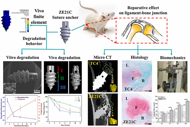 近期,鄭州大學(xué)材料科學(xué)與工程學(xué)院關(guān)紹康教授團(tuán)隊(duì)在科愛(ài)創(chuàng)辦的期刊Bioactive Materials上發(fā)表文章:ZE21C鎂合金縫合錨釘的降解行為及其對(duì)韌帶-骨的修復(fù)效應(yīng)。研究采用ZE21C鎂合金設(shè)計(jì)制備了縫合錨釘。ZE21C縫合錨釘在重建SD大鼠髕韌帶-脛骨近端12周后仍能保持完整的機(jī)械結(jié)構(gòu),并且促進(jìn)了縫合錨釘上方的骨愈合和纖維軟骨界面的再生,加速了韌帶-骨的修復(fù)。