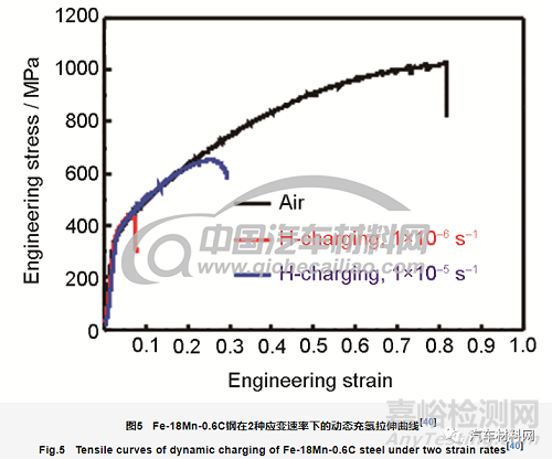 此外,Koyama等[65]研究了“預(yù)應(yīng)變速率”對高錳鋼氫致延遲開裂的影響。在無H條件下,以不同的預(yù)應(yīng)變速率拉伸到應(yīng)變?yōu)?9%時停止,保持該位移狀態(tài),充氫。如果在10 h內(nèi)試樣未發(fā)生延遲斷裂,則將試樣再次以最初的應(yīng)變速率拉伸直至斷裂。結(jié)果顯示,在較慢預(yù)應(yīng)變速率(1.7×10-5和1.7×10-4 s-1)下能夠發(fā)生氫致延遲斷裂,而在較快預(yù)應(yīng)變速率(1.7×10-3和1.7×10-2 s-1)下不發(fā)生氫致延遲斷裂。因此,通過增加預(yù)應(yīng)變速率可以抑制氫致延遲斷裂。作者認(rèn)為這與C的應(yīng)變時效有關(guān)。