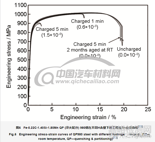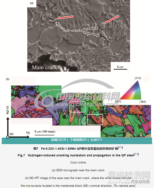 (3) 與TRIP鋼相似,QP鋼的氫脆主要表現(xiàn)為塑性損失,強度損失較小,氫致裂紋主要沿應(yīng)變誘發(fā)的新鮮馬氏體或M/γ界面形核。