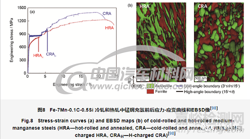 目前對中錳鋼的研究主要集中在微觀組織演化和力學(xué)性能方面,對其氫脆性能的研究報道比較少,僅有的幾篇文獻顯示中錳鋼有明顯的氫脆現(xiàn)象。如Han等[98]對比研究了熱軋和冷軋2種組織狀態(tài)的中錳鋼,發(fā)現(xiàn)2種軋制狀態(tài)均表現(xiàn)出很大的氫致塑性損失和強度損失,如圖8[98]所示,但是冷軋態(tài)的損失比熱軋態(tài)要小一些。對此Han等[98]從裂紋擴展角度給出如下解釋:熱軋態(tài)為條狀組織,裂紋沿原奧氏體晶界擴展,路徑平直;而冷軋態(tài)晶粒細小,裂紋沿晶界擴展時經(jīng)常改變方向,或者進入晶粒內(nèi)部,路徑曲折,因而抗氫脆性能更好。Kim等[12]發(fā)現(xiàn),在變形過程中,被逆變奧氏體捕獲的H原子會被新生成的馬氏體所繼承,而馬氏體的H溶解度遠低于奧氏體,導(dǎo)致H在某處(如界面)富集形成氫致裂紋,造成試樣斷裂。Wang等[99,100]對Fe-9Mn-3Ni-1.4Al中錳鋼開展了一系列研究,發(fā)現(xiàn)退火后的試樣在馬氏體板條界面處含有納米級薄膜狀奧氏體;未經(jīng)退火的試樣為全馬氏體組織,不含奧氏體。預(yù)充氫拉伸結(jié)果顯示,不含奧氏體的試樣在彈性階段就發(fā)生斷裂,而含薄膜狀奧氏體的試樣在發(fā)生一定的塑性變形后才斷裂,抗氫脆性能明顯優(yōu)于不含奧氏體的試樣。同時發(fā)現(xiàn),在新生馬氏體與鐵素體界面處,氫致裂紋形核、長大并相互合并。