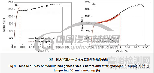 本課題組對含10%Mn的中錳鋼分別進行了400 ℃回火和600 ℃兩相區(qū)退火處理,獲得奧氏體體積分?jǐn)?shù)分別為47%和79%的2種試樣,抗拉強度分別為1728和1690 MPa,延伸率分別為27.3%和28.7%,如圖9所示。但是預(yù)充氫后拉伸,回火和退火態(tài)的延伸率分別剩余3.5%和16%,對應(yīng)的塑性損失分別為87%和45%,相差近一倍。這表明中錳鋼的氫脆敏感性與微觀組織中的奧氏體含量和穩(wěn)定性有密切關(guān)系,更多信息有待進一步深入分析。