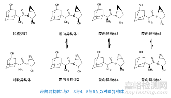 從結(jié)構(gòu)式可知沙格列汀結(jié)構(gòu)中含有4個(gè)手型中心,理論上可產(chǎn)生16個(gè)異構(gòu)體,由于環(huán)丙基上的兩個(gè)手性中心只能產(chǎn)生2種構(gòu)象,因此實(shí)際上包括沙格列汀在內(nèi)總共有8個(gè)異構(gòu)體,見圖2。