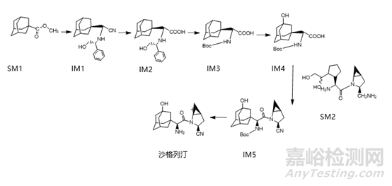 文獻(xiàn)報(bào)道的沙格列汀合成路線有很多,本文參考原研公司發(fā)表的經(jīng)改進(jìn)的工藝路線對(duì)沙格列汀中異構(gòu)體雜質(zhì)的控制進(jìn)行探討,合成路線如下圖3所示。從反應(yīng)式可以看出,沙格列汀中一個(gè)手性中心來自于反應(yīng)過程構(gòu)建,三個(gè)手性中心由起始物料SM2引入,因此對(duì)于沙格列汀應(yīng)采取起始物料控制、過程控制和終產(chǎn)品控制相結(jié)合的模式。