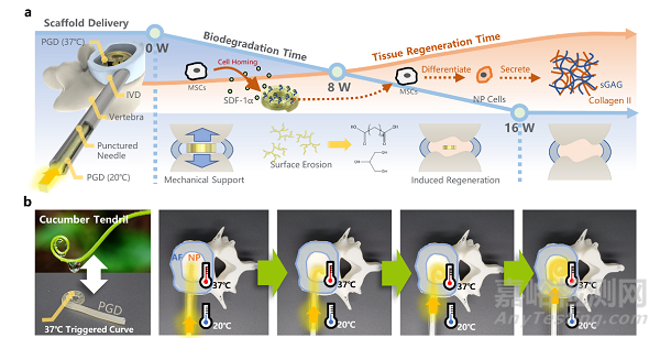 近日,北京航空航天大學(xué)生物力學(xué)與力生物學(xué)教育部重點實驗室、北京市生物醫(yī)學(xué)工程高精尖創(chuàng)新中心樊瑜波教授、王麗珍教授團隊報道了一種新型微創(chuàng)植入式可降解髓核支架(圖1),它能夠通過溫敏形狀記憶聚合物材料實現(xiàn)支架的微創(chuàng)遞送,同時提供匹配在體髓核組織的支撐性能,利用支架所搭載的趨化因子實現(xiàn)自體干細胞向退變髓核組織的募集同時抑制椎間盤退變進程。