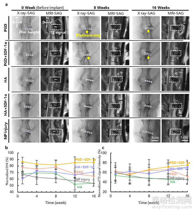 研究小組首先對形狀記憶聚合物聚十二烷二酸甘油酯(PGD)進行性能調(diào)控(圖2),并結(jié)合實驗及數(shù)值模擬技術(shù)優(yōu)選了彈性模量約1.10 MPa的PGD材料制備髓核支架,使其接近髓核組織在體壓縮模量1.01±0.43 MPa;PGD髓核支架的微創(chuàng)結(jié)構(gòu)則借鑒了黃瓜藤蔓的卷須過程,由于支架材料PGD的轉(zhuǎn)變溫度介于體溫與室溫之間,在室溫下支架呈小截面積的直藤蔓形態(tài),此時可以通過穿刺椎間盤的空心針被遞送進髓核,支架形態(tài)在進入髓核腔后受體溫驅(qū)動將在10 s內(nèi)轉(zhuǎn)變?yōu)榫眄殸睿环矫嬖龃蟮慕孛娣e避免了椎間盤在術(shù)后受力下從纖維環(huán)穿刺孔中擠出,另一方面為退變椎間盤提供物理支撐為髓核的組織重建提供空間;隨后借助新西蘭兔腰椎間盤退變模型,從臨床指征、細胞組成、術(shù)后間盤力學(xué)性能等多方面驗證PGD支架的髓核功能修復(fù)情況,結(jié)果顯示PGD髓核支架能夠在植入后即時提供有效力學(xué)支撐,維持正常椎間高度的約80%(圖3),通過支架載有的基質(zhì)細胞衍生因子有效招募自體干細胞進入退變髓核內(nèi)(圖4),植入后16周依然能維持初始椎間高度且力學(xué)性能接近正常椎間盤(圖5)。本研究為組織工程退變椎間盤的功能再生提供了新思路,有望進一步應(yīng)用于椎間盤退變的臨床治療中。