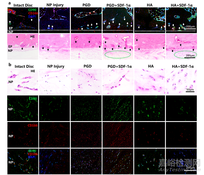 圖4 PGD髓核支架組及透明質(zhì)酸支架組、假手術(shù)組、正常組間在植入兔腰椎間盤后髓核及其周圍組織內(nèi)細胞形態(tài)及組成