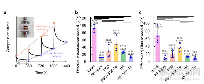 圖5 PGD髓核支架組及透明質(zhì)酸支架組、假手術(shù)組、正常組間在植入兔腰椎間盤16周后的力學(xué)性能比較