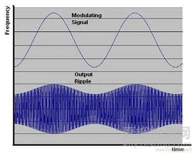 大多數(shù)開關(guān)穩(wěn)壓器都會(huì)呈現(xiàn)與頻率相關(guān)的紋波:開關(guān)頻率越低則紋波越多,開關(guān)頻率越高則紋波越少。因此,如果對開關(guān)時(shí)鐘進(jìn)行頻率調(diào)制,則開關(guān)穩(wěn)壓器的紋波將呈現(xiàn)幅度調(diào)制。如果時(shí)鐘的調(diào)制信號(hào)是周期性的 (例如正弦波或三角波),則將呈現(xiàn)周期性的紋波調(diào)制,而且在調(diào)制頻率上存在一個(gè)明顯的頻譜分量 (圖 1)。