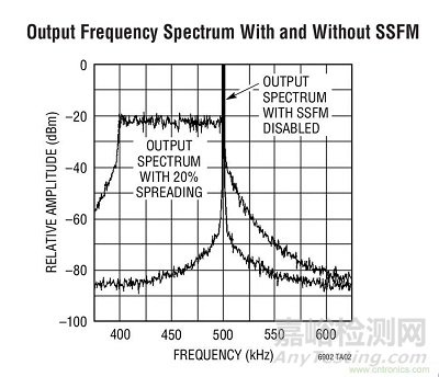 SSFM 不允許發(fā)射能量在任何接收器的頻帶中停留過長時(shí)間,從而改善了EMI。有效SSFM的關(guān)鍵決定因素是頻率擴(kuò)展量和調(diào)制速率。對于開關(guān)穩(wěn)壓器應(yīng)用來說,典型擴(kuò)展量為 ±10%,最佳調(diào)制速率取決于調(diào)制方式。SSFM 可采用各種頻率擴(kuò)展方法,例如使用正弦波或三角波調(diào)制時(shí)鐘頻率。