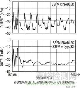 由于調(diào)制頻率遠(yuǎn)低于開關(guān)穩(wěn)壓器的時(shí)鐘頻率,因此可能難以濾除。由于下游電路中的電源噪聲耦合或有限的電源抑制,這可能導(dǎo)致可聽音或明顯的偽像等問題。偽隨機(jī)頻率調(diào)制能夠消除這種周期性紋波。采用偽隨機(jī)頻率調(diào)制時(shí),時(shí)鐘以偽隨機(jī)方式從一個(gè)頻率轉(zhuǎn)換到另一個(gè)頻率。由于開關(guān)穩(wěn)壓器的輸出紋波由類噪聲信號(hào)進(jìn)行幅度調(diào)制,因此輸出看似沒有進(jìn)行調(diào)制,而且下游系統(tǒng)的影響可以忽略不計(jì)。