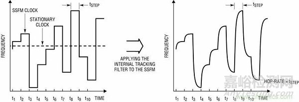 為了解決上述周期性紋波問題,這些硅振蕩器使用偽隨機(jī)頻率調(diào)制。利用該技術(shù),開關(guān)穩(wěn)壓器時(shí)鐘以偽隨機(jī)方式從一個(gè)頻率轉(zhuǎn)換到另一個(gè)頻率。頻率偏移率或跳頻速率越高,開關(guān)穩(wěn)壓器在給定頻率下的工作時(shí)間越短,并且對于給定的接收器間隔,EMI 在帶內(nèi)的時(shí)間將越短。
