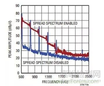 圖 2. 擴(kuò)頻調(diào)制在更寬的時(shí)鐘頻帶內(nèi)產(chǎn)生更低的峰值能量