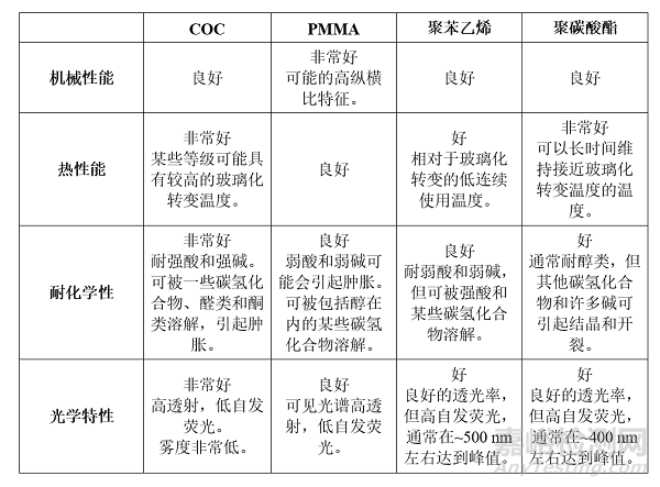 一系列工程熱塑性聚合物也可用于LOC應用,包括聚甲基丙烯酸甲酯(PMMA)、聚苯乙烯(PS)、聚碳酸酯(PC)或環(huán)烯烴共聚物(COC)。它們具有光學透明性,通??赡褪芏喾N化學品,兼容廣泛的制造和連接技術(shù),使其成為理想的選擇。下面總結(jié)了這些材料的部分相對優(yōu)缺點。