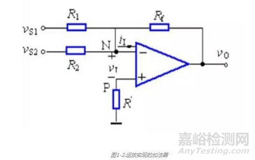 如下圖1-2,是運放實現(xiàn)的加法器,用虛短和虛斷的方法來分析此電路。
