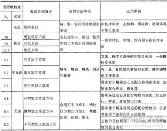 關(guān)于表面粗糙度的數(shù)值和表面特征、獲得方法、應(yīng)用舉例請(qǐng)參見下表。