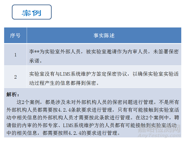 該條款主要是對人員的保密要求,對能夠接觸到實(shí)驗(yàn)室活動信息的人員,要對在實(shí)施實(shí)驗(yàn)室活動過程中獲得或產(chǎn)生的所有信息保密。條款中所列的幾類人員,不一定都適用于實(shí)驗(yàn)室, 因此實(shí)驗(yàn)室首先應(yīng)識別哪類外部機(jī)構(gòu)人員需要按此條款進(jìn)行管理,制定并實(shí)施相應(yīng)的保密措施。