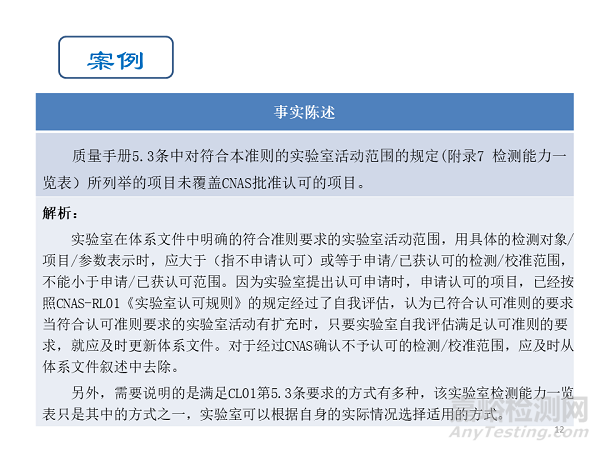 —— 應(yīng)在體系文件中明確實(shí)驗(yàn)室符合認(rèn)可準(zhǔn)則要求的實(shí)驗(yàn)室活動范圍,可以就活動范圍廣義的泛泛的敘述,也可以用具體的檢測/校準(zhǔn)對象/項(xiàng)目/參數(shù)/測量范圍/CMC等表示。用檢測/校準(zhǔn)對象/項(xiàng)目/參數(shù)/測量范圍/CMC等表示的活動范圍應(yīng)大于/優(yōu)于(指不申請認(rèn)可)或等于申請/已獲認(rèn)可的檢測/校準(zhǔn)范圍。當(dāng)符合準(zhǔn)則要求的實(shí)驗(yàn)室活動有變化時,實(shí)驗(yàn)室應(yīng)及時更新體系文件。