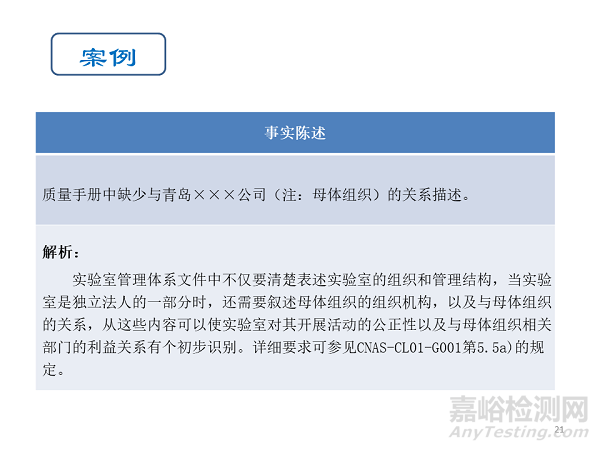 如果實(shí)驗(yàn)室不是獨(dú)立法人機(jī)構(gòu),是獨(dú)立法人的一部分,則體系文件中還需要母體組織的組織機(jī)構(gòu)圖,且在母體組織的組織機(jī)構(gòu)圖中,應(yīng)明確列出實(shí)驗(yàn)室在哪個部門管轄下,即明確實(shí)驗(yàn)室在母體中的位置。在CNAS-CL01-G001《CNAS-CL01<檢測和校準(zhǔn)實(shí)驗(yàn)室能力認(rèn)可準(zhǔn)則>應(yīng)用要求》第5.5 a)條明確規(guī)定“當(dāng)實(shí)驗(yàn)室所在的母體機(jī)構(gòu)還從事檢測或校準(zhǔn)以外的活動時,實(shí)驗(yàn)室管理體系文件中不僅應(yīng)明確實(shí)驗(yàn)室自身的組織結(jié)構(gòu),還應(yīng)明確母體機(jī)構(gòu)的組織結(jié)構(gòu)圖,顯示實(shí)驗(yàn)室在母體機(jī)構(gòu)中的位置,并說明母體機(jī)構(gòu)所從事的其他活動。”