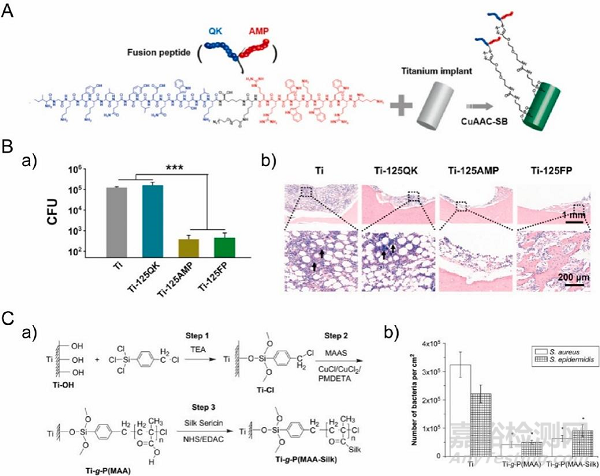 圖2:(A)鈦表面通過CuAAC-SB方法點擊固定多肽。(B)種植體在體內(nèi)感染模型下的骨修復(fù)。(C)鈦表面引發(fā)的ATRP聚合并固定生物分子的示意圖。