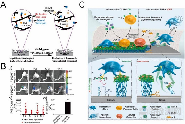 圖3:(A)鈦表面的核酸酶降解膜層示意圖。(B)種植體在體內(nèi)感染模型下的酶促發(fā)降解修復(fù)過程。(C)鈦表面堿性磷酸酶引發(fā)的成骨細胞和巨噬細胞的動態(tài)調(diào)控示意圖。