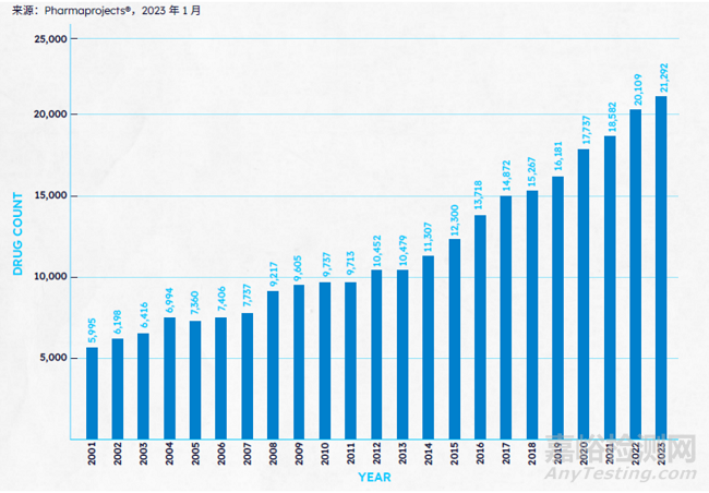 過(guò)去三年,新冠疫情影響下制藥行業(yè)的動(dòng)蕩逐步平息,全球研發(fā)開(kāi)始步入穩(wěn)定增長(zhǎng)的階段。據(jù)Pharmaprojects® 2023年1月數(shù)據(jù)顯示,2023年全球管線總規(guī)模再創(chuàng)新高,全球藥品及疫苗數(shù)量共計(jì)21292個(gè),較去年上漲5.9%。