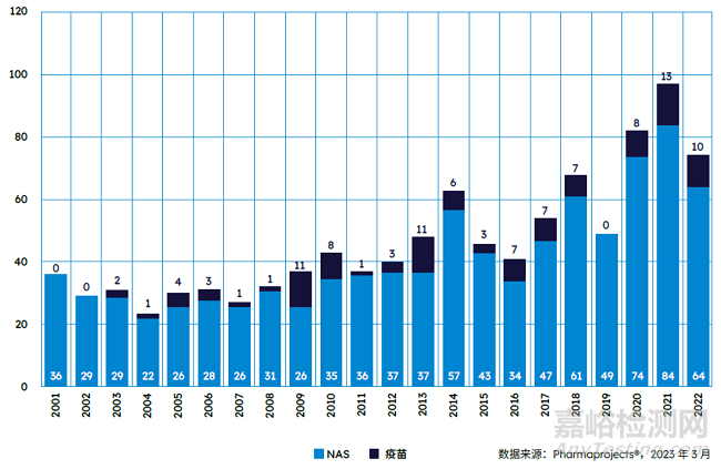 在《2023年醫(yī)藥研發(fā)年度回顧》的基礎(chǔ)上推出的補(bǔ)充報(bào)告《2022年上市的新活性物質(zhì)》, 就全球研發(fā)成果上市情況進(jìn)行深入解讀??v覽過(guò)往五年,全球推出的NAS(新活性物質(zhì),New Active Substance)數(shù)量一路上揚(yáng),彰顯了全球醫(yī)藥創(chuàng)新的蓬勃生機(jī)。報(bào)告指出,2022 年全球共推出 73 款新藥,其中包含 74 種新活性物質(zhì),是全球制藥史上排名前三的年份。